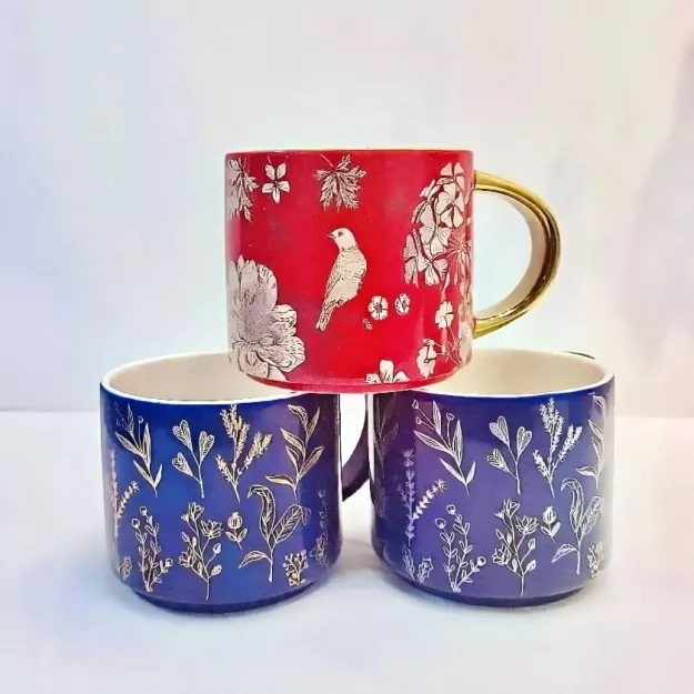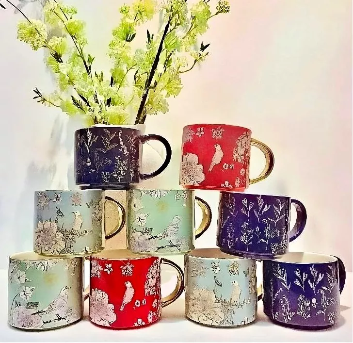Ова керамичка шоља са електроплираном ручицом за злато, пажљиво израђена са наразима, утјеловљује јединствени шарм инспирисан природом. Било да су то деликатне текстуре цветајућих цветова, живахних облика украшених птица или очаравајуће обрасце природних блокова у боји, шалица деликатно снима поклоне флоре, фауне и живахних боја. Да би одговарали сваком стилу, ручка шоља је прилагодљива. Златна верзија блиста богатом, златном нијансом која подсећа на 18К злата, додајући додир софистицираности. Такође се може прилагодити вашој омиљеној боји.