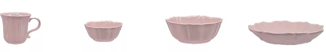 Уз претежно макарон ружичасте колор у боји, ова мекана боја мале засићености ствара умирујуће ефекат, прилагођавајући се различитим амбицијамама са домаћим дом, од модерног минималистичког за инспирисану и рустикалну и рустичну, стварајући упечатљив нагласак без потребе да се нагласили наглашени нагласак. Ручно извучено, таласасте ивице здјела и плоча прекрши стереотип традиционалног прибор за прибор. Мекани су на додир, не-клизање и природно не-клизање када се држе, у сваком детаљу приказују пажљиву снагу.