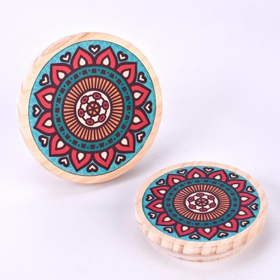 Персонализовани образац за штампање дрвених поклопца израђен је од лаког обојеног природног дрвета, који садржи узорни надахну на мандалу. Сваки поклопац има своју јединствену личност. Симетрични геометријски облици окружују цветне мотиве и живахне боје-наранџасте, ружичасте, плаве и зелене боје стварају уметничка и јединствена естетика. Поклопац су лаган и практичан, нудећи и заптивна и декоративне функције. Погодни су за домаће мирисе, украсе поклона и друге апликације, савршено мешају природне текстуре са персонализованим естетиком.